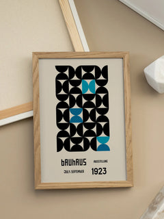 Dieses Poster zeigt eine grafische Illustration im klassischen Bauhaus-Stil. Es besteht aus einem Muster aus schwarzen und blauen geometrischen Formen auf einem beigefarbenen Hintergrund. Der Text "Bauhaus Ausstellung 1923" ist in einem charakteristischen Schriftstil gehalten. Dieses Design verkörpert die zeitlose Ästhetik der Bauhaus-Bewegung und ist ein perfektes Beispiel für minimalistisches und funktionales Design.
