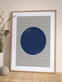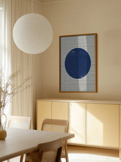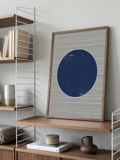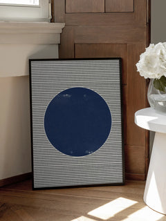 Dieses Poster zeigt eine grafische Darstellung mit einem großen blauen Kreis in der Mitte, der von einem schwarz-weiß gestreiften Hintergrund umgeben ist. Das Design ist schlicht und modern, ideal für ein Zuhause, das einen kreativen und zeitgenössischen Stil anstrebt. Die Kombination aus geometrischen Formen und minimalistischen Farben verleiht jedem Raum eine elegante und stilvolle Note.
