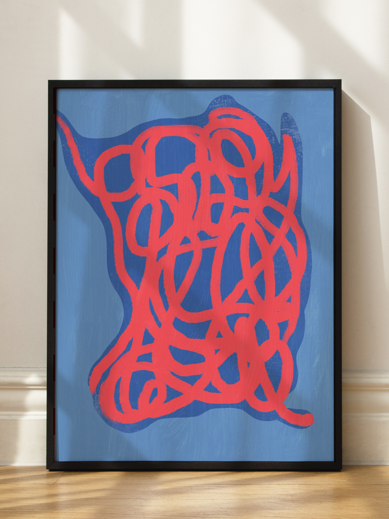 Diese grafische Illustration zeigt einen dynamischen roten Wirbel auf einem blauen Hintergrund. Die kräftigen Farben und das abstrakte Design machen dieses Poster zu einem perfekten Blickfang für jede moderne Einrichtung. Bringen Sie mit diesem bunten Kunstwerk einen frischen Hauch in Ihr Zuhause.