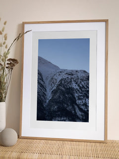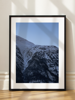Dieses Poster zeigt eine atemberaubende Fotografie von schneebedeckten Bergen unter einem klaren blauen Himmel. Die ruhige und friedliche Atmosphäre des Bildes bringt die majestätische Schönheit der Natur in dein Zuhause. Perfekt, um jedem Raum eine beruhigende und erfrischende Note zu verleihen.