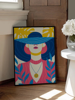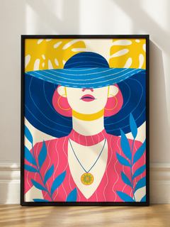 Dieses lebendige Poster zeigt eine stilisierte Illustration einer Frau mit einem großen, blau gestreiften Hut. Umgeben von blauen Pflanzen und gelben Blättern, vermittelt das Bild ein sommerliches Gefühl. Die leuchtenden Farben und das moderne Design machen es zu einem auffälligen Kunstwerk, das jedem Raum eine frische und fröhliche Atmosphäre verleiht.