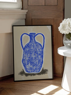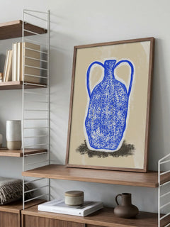 Eine mediterrane Amphore in leuchtendem Blau steht im Zentrum dieser kunstvollen Illustration. Die texturierte Oberfläche und warmen Beigetöne schaffen eine gemütliche Atmosphäre. Ergänzt mediterrane und klassische Einrichtung perfekt.