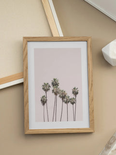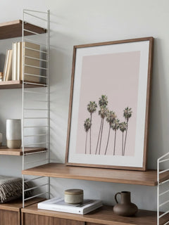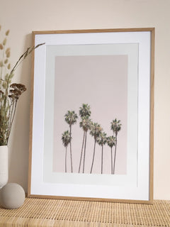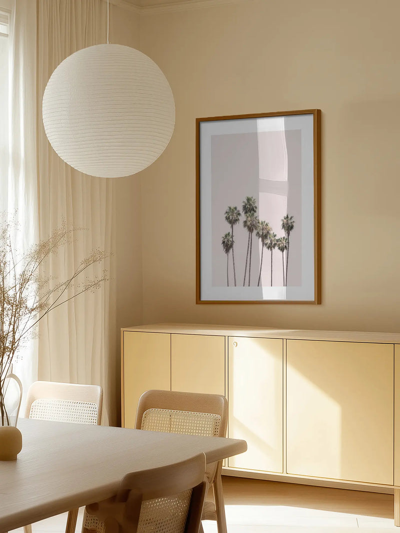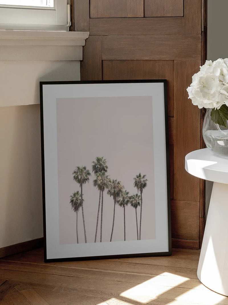 Dieses Poster zeigt eine Fotografie von hohen Palmen, die sich vor einem zarten, hellrosa Himmel abheben. Die schlanken Silhouetten der Palmen vermitteln ein Gefühl von Ruhe und Gelassenheit, während der rosa Himmel eine sanfte, sommerliche Atmosphäre schafft. Perfekt, um einen Hauch von Sommer und tropischem Flair in dein Zuhause zu bringen.