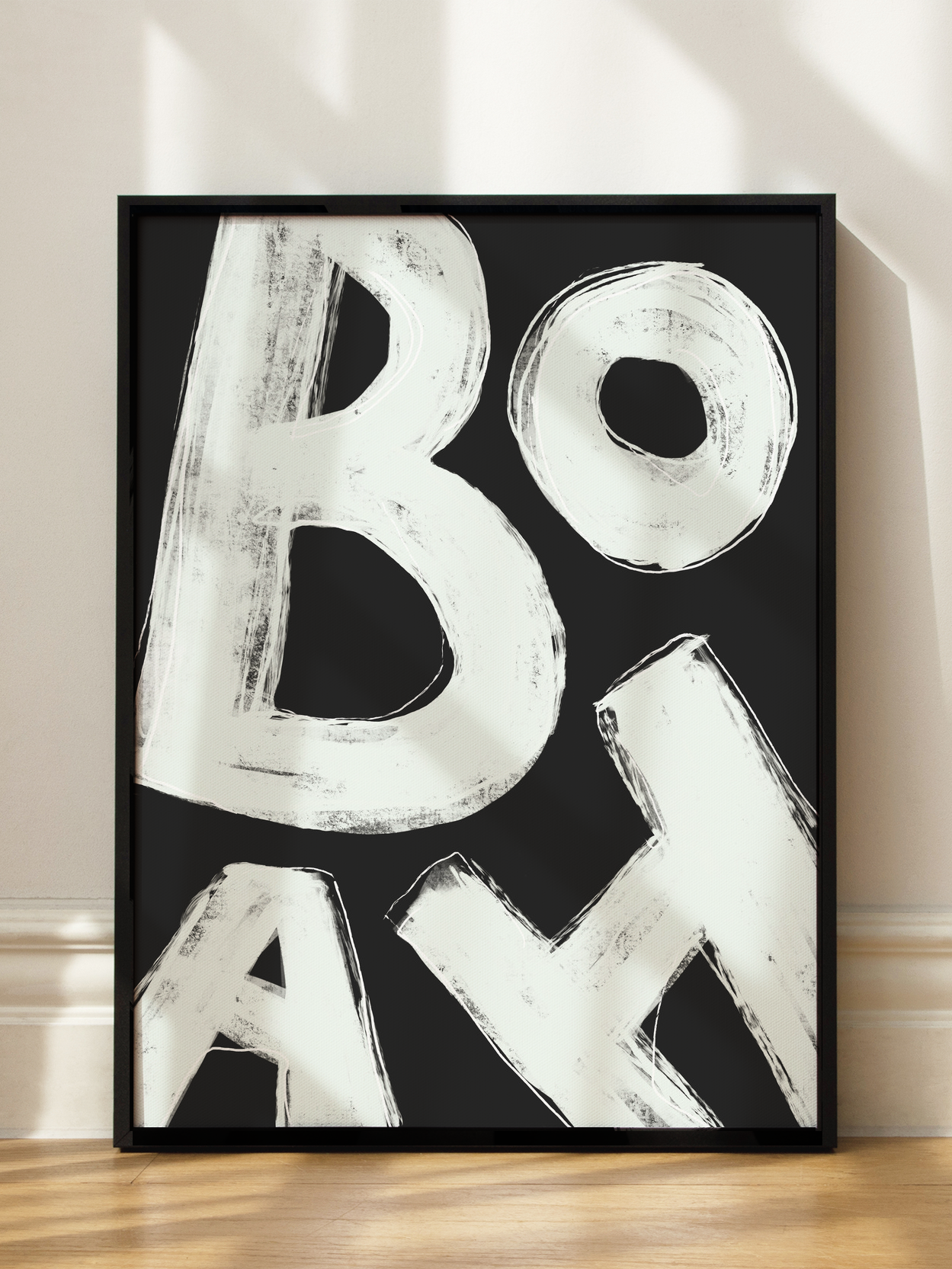 Dieses Poster zeigt den Text „BOAX“ in großen, weißen Buchstaben auf einem tiefschwarzen Hintergrund. Die Buchstaben sind in einem handgezeichneten Stil gehalten, der dem Bild eine künstlerische und moderne Note verleiht. Der Kontrast zwischen dem weißen Text und dem dunklen Hintergrund sorgt für eine starke visuelle Wirkung, die in jedem Raum ein Statement setzt. Perfekt für Liebhaber von minimalistischer und typografischer Kunst.