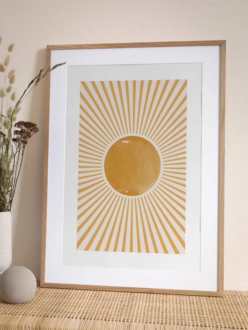 Die grafische Illustration zeigt eine orangefarbene Sonne, die von strahlenden Linien umgeben ist, auf einem beigen Hintergrund. Die warmen Töne und das einfache Design machen dieses Kunstwerk zu einem perfekten Akzent für ein lebendiges und einladendes Zuhause. Es strahlt Wärme und Positivität aus und bringt einen Hauch von Sonnenschein in jeden Raum.