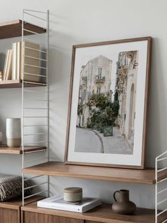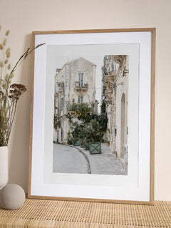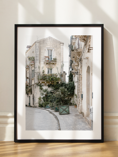 Die Fotografie zeigt eine charmante Straße in Sizilien, gesäumt von einem Gebäude, das mit üppigen Pflanzen und Kakteen geschmückt ist. Die Szene strahlt eine ruhige und friedliche Atmosphäre aus, ideal für Pflanzenliebhaber. Dieses Bild bringt einen Hauch von mediterranem Flair in dein Zuhause und schafft eine entspannende Umgebung.