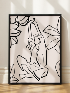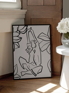 Dieses Poster zeigt eine stilvolle Illustration einer Frau, die mit geschlossenen Augen sitzt und sich streckt, umgeben von großen Blättern auf einem beigen Hintergrund. Die Komposition strahlt Ruhe und Gelassenheit aus und ist ideal für ein Schlafzimmer oder Wohnzimmer geeignet. Die sanften Linien und der minimalistische Stil verleihen dem Bild eine moderne und beruhigende Ästhetik.
