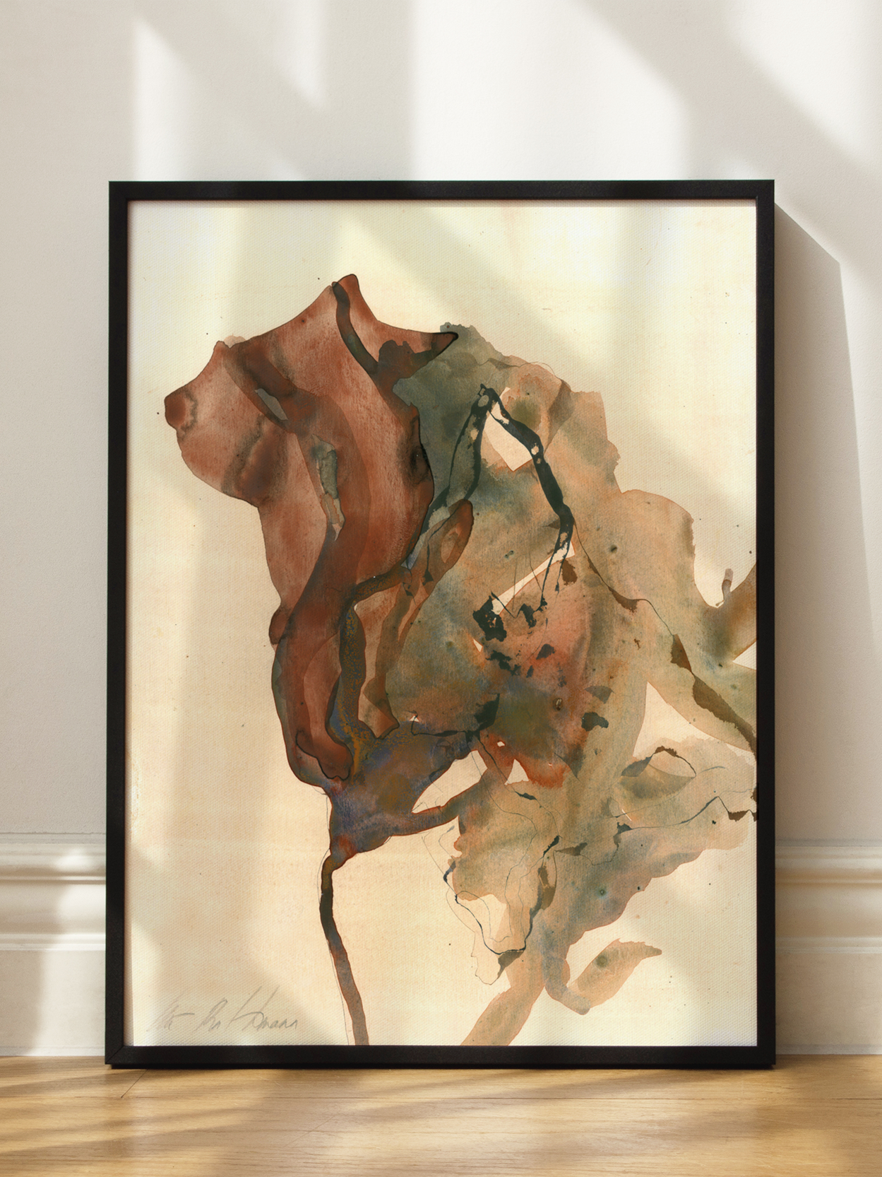 Ein abstraktes Kunstwerk mit fließenden Formen und erdigen Farben. Die weichen Linien und natürlichen Töne erinnern an Blätter oder organische Formen. Die Farbpalette ist subtil und gedämpft, mit Brauntönen als Hauptfarbe und Akzenten von Grün, Beige und Schwarz. Die Farben fließen ineinander und verleihen dem Kunstwerk ein Gefühl von Bewegung und Tiefe.