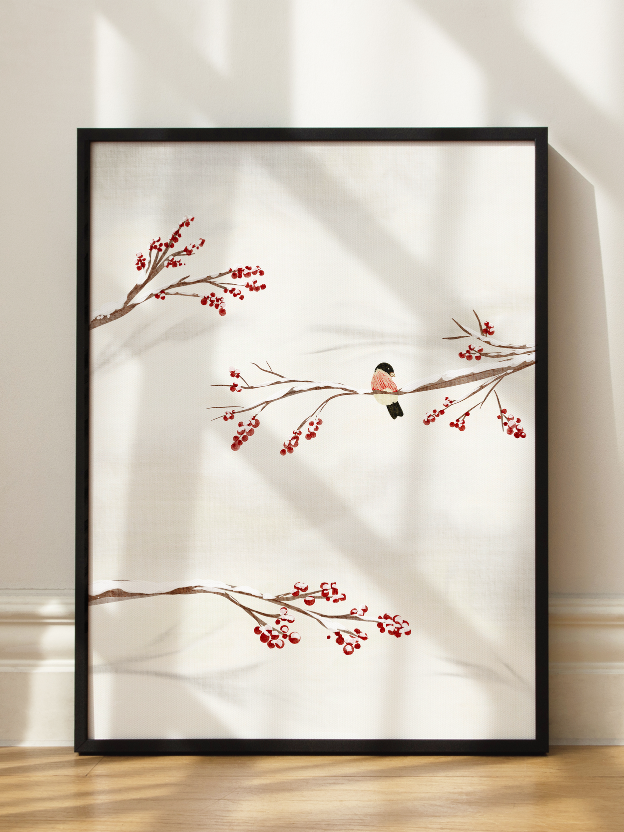 Ein bezauberndes Poster eines Dompfaffs, der auf einem schneebedeckten Ast sitzt. Umgeben von roten Beeren und einem sanften, hellen Hintergrund, fängt dieses Poster die ruhige und friedliche Atmosphäre des Winters ein. Perfekt, um eine saisonale Note in dein Zuhause zu bringen.