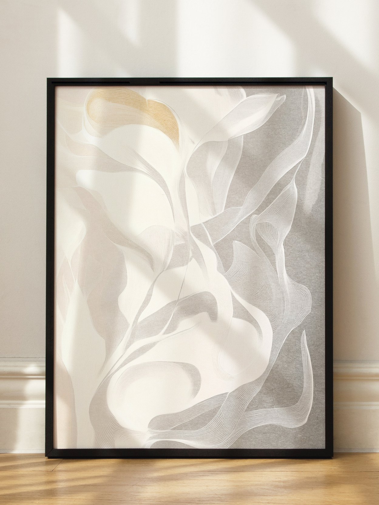 Diese Illustration zeigt eine Calla in sanften Beigetönen, die durch geschwungene Linien und einen neutralen Hintergrund hervorgehoben wird. Die Komposition strahlt Ruhe und Gelassenheit aus und ist ideal für ein minimalistisches Zuhause geeignet.