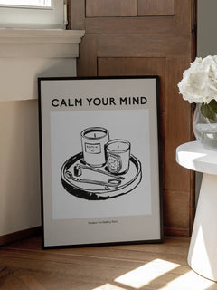 Dieses Poster zeigt eine stilvolle Illustration von zwei Kerzen auf einem Tablett, begleitet von dem beruhigenden Text „Calm Your Mind“. Unten steht „Modern Art Gallery, Paris“, was dem Bild eine elegante Note verleiht. Perfekt, um eine ruhige und entspannende Atmosphäre in jedem Raum zu schaffen.