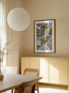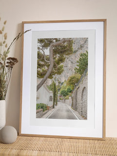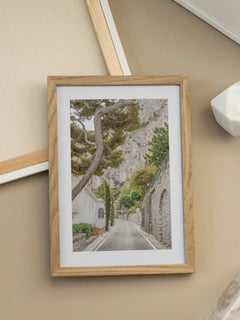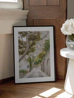 Dieses Poster zeigt eine malerische Straße auf Capri, gesäumt von charmanten Gebäuden und üppigem Grün, mit einer beeindruckenden Berglandschaft im Hintergrund. Es fängt die ruhige und idyllische Atmosphäre der italienischen Insel ein, perfekt für Naturliebhaber und Reisefans.