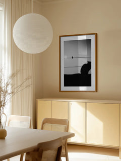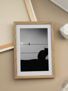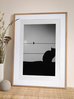 Dieses Poster zeigt eine faszinierende Silhouette einer Katze und eines Vogels, die auf Stromleitungen sitzen. Der Hintergrund ist ein sanfter Grauton, der die ruhige und nachdenkliche Stimmung der Szene unterstreicht. Die Komposition fängt einen Moment der Ruhe und des Gleichgewichts in der Natur ein und verleiht jedem Raum eine subtile Eleganz.