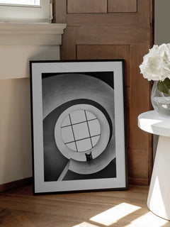 Ein faszinierendes schwarz-weißes Poster, das eine Katze zeigt, die neugierig von unten eine Wendeltreppe hinaufschaut. Die Szene wird durch ein rundes Fenster eingefangen, das einen einzigartigen Blickwinkel bietet. Dieses verspielte und zugleich elegante Kunstwerk eignet sich hervorragend für eine Bilderwand und verleiht jedem Raum einen Hauch von Raffinesse und Charme.