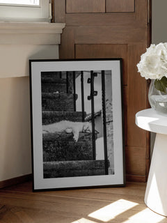 Diese Schwarz-Weiß-Fotografie zeigt eine Katze, die friedlich auf einer alten Steintreppe schläft. Die Szene strahlt Ruhe und Gelassenheit aus und fängt einen Moment der Entspannung ein. Dieses charmante Katzenposter ist ideal für Tierliebhaber und verleiht jedem Raum eine gemütliche und einladende Atmosphäre.