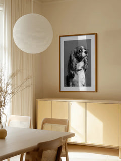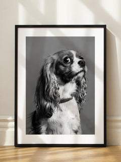 Elegantes Schwarz-Weiß-Portrait eines Cavalier King Charles Spaniels mit seinem charakteristischen seidigen Fell. Das ausdrucksstarke Hundeportrait fügt sich harmonisch in klassische Wohnräume ein. Ein zeitloser Hingucker für Hundeliebhaber und Tierfreunde.