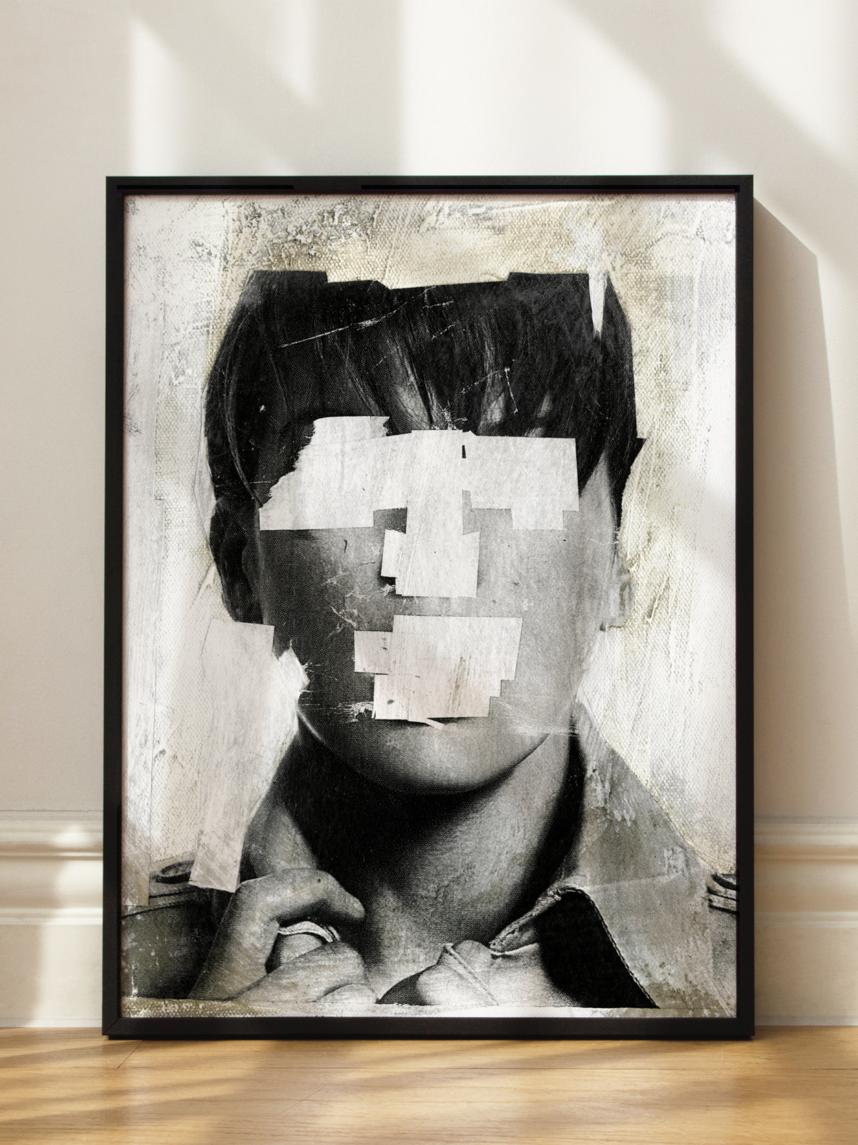 Ein faszinierendes Kunstposter, das einen Kopf zeigt, der mit weißem Klebeband überklebt ist. Diese eindrucksvolle Collage zieht garantiert alle Blicke auf sich und verleiht deiner Einrichtung einen besonderen, künstlerischen Akzent. Das monochrome Design und die kreative Darstellung machen es zu einem einzigartigen Blickfang.