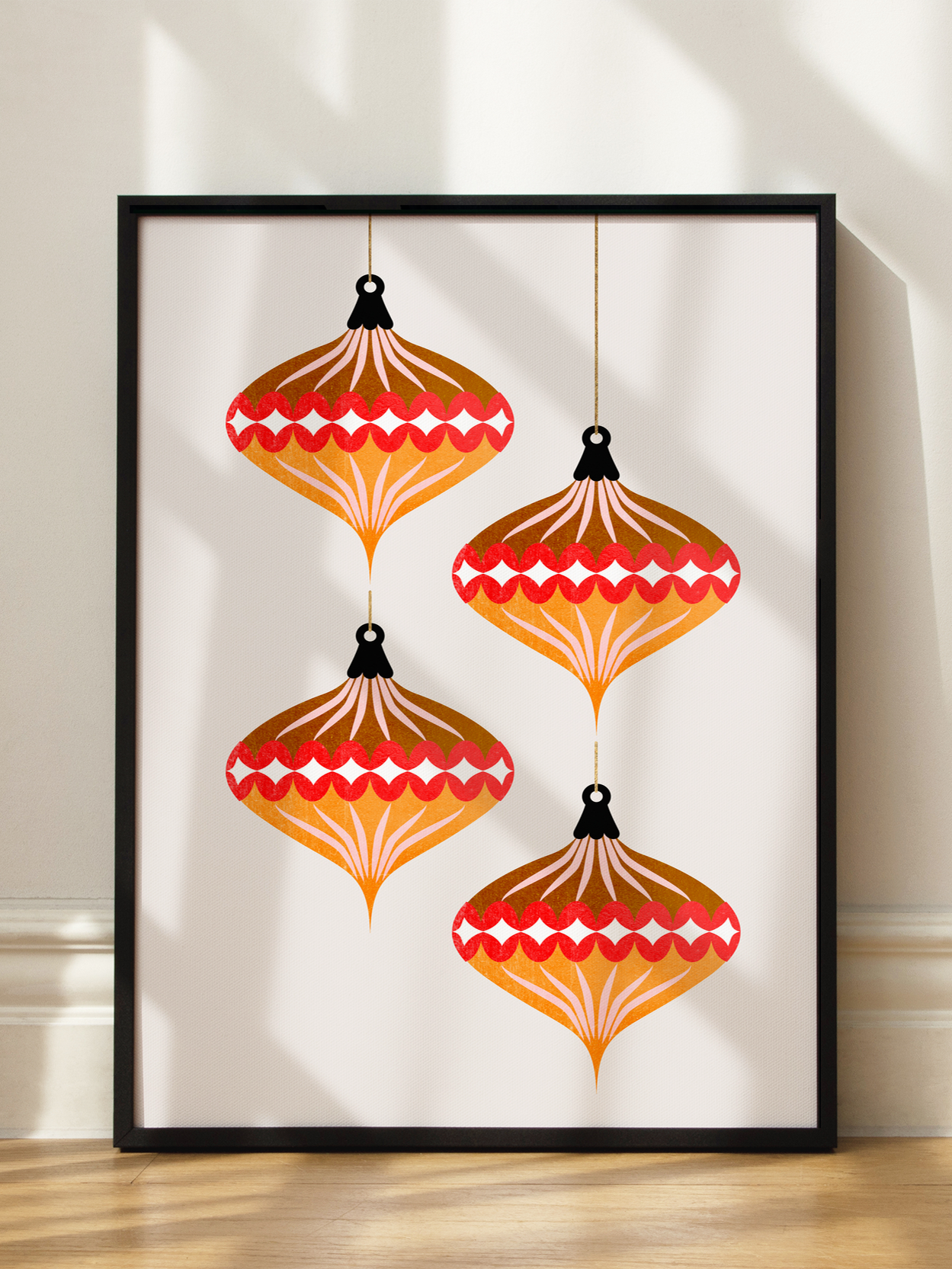 Ein Poster mit orangefarbenen Weihnachtskugeln auf hellem Hintergrund. Dieses farbenfrohe Poster bringt festliche Stimmung in dein Zuhause und eignet sich perfekt als Teil deiner Weihnachtsdekoration.