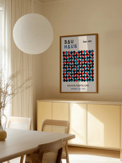 Dieses Poster ist eine Hommage an die Bauhaus-Ausstellung von 1923 in Weimar. Es zeigt geometrische Formen in Rot, Blau und Schwarz auf einem beigen Hintergrund. Der Text „Bauhaus Ausstellung“ und „Weimar | Juli 1923“ ist unten zu sehen. Ein perfektes Stück für Liebhaber von Bauhaus-Design und geometrischer Kunst.