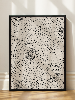 Ein hypnotisches Punktmuster in spiralförmiger Anordnung auf hellem Grund. Die unterschiedlichen Größen der schwarzen Punkte erzeugen eine dynamische Tiefenwirkung. Ein moderner Hingucker für minimalistische Räume.