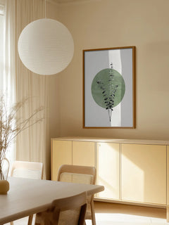 Schwarz-weiß-Illustration von Eukalyptus vor einem grünen Kreis auf einem hellgrauen Hintergrund. Dieses minimalistische Pflanzenposter ist perfekt für eine Küche, die du mit botanischen Postern dekorieren möchtest.