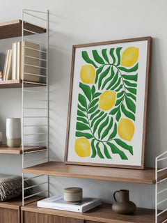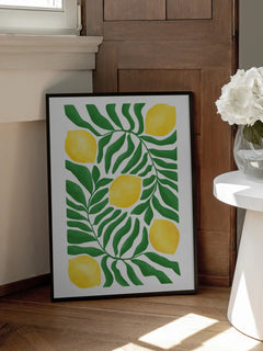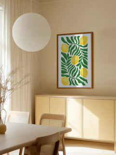 Ein Poster mit einem Muster aus Zitronen und grünen Blättern. Die leuchtend gelben Zitronen heben sich von den dunkelgrünen Blättern ab und schaffen einen schönen Kontrast, der Frische und Lebendigkeit ausstrahlt. Dieses Poster ist perfekt, um eine Küche oder einen Essbereich zu verschönern.