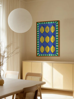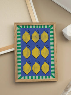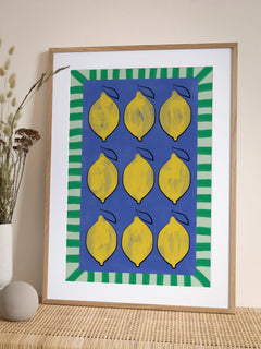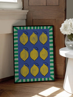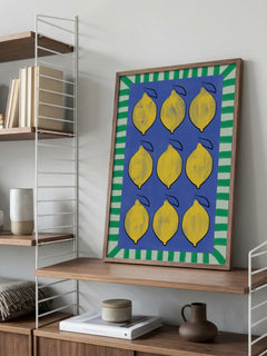 Dieses lebendige Poster zeigt neun gelbe Zitronen auf einem tiefblauen Hintergrund, umrahmt von einem grünen Streifenmuster. Die kräftigen Farben und das frische Design machen es zu einer idealen Ergänzung für eine farbenfrohe Küche oder einen Essbereich. Die Anordnung der Zitronen und der kontrastreiche Rahmen verleihen dem Bild eine moderne und fröhliche Ausstrahlung.