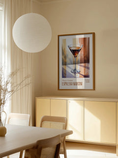 Dieses stilvolle Poster zeigt einen eleganten Espresso Martini in einem Cocktailglas. Der Hintergrund ist in warmen Beige- und Brauntönen gehalten, die dem Bild eine gemütliche und einladende Atmosphäre verleihen. Unter dem Glas befindet sich das Rezept für diesen klassischen Cocktail, was das Poster zu einer perfekten Ergänzung für die Küche oder den Essbereich macht. Ideal für Cocktail-Liebhaber und alle, die ein stilvolles Ambiente schaffen möchten.