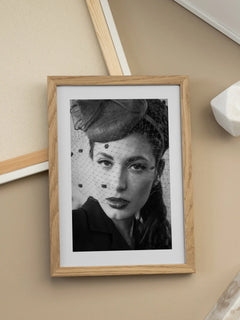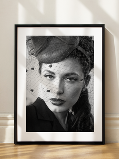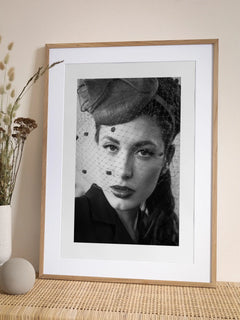 Ein klassisches Schwarz-Weiß-Fotoposter einer Frau in einem eleganten Hut mit Schleier. Dieses Bild fängt die Essenz der Vintage-Mode ein und ist ein perfektes Statement-Piece für Liebhaber zeitloser Eleganz. Ideal für eine Galeriewand oder als Einzelstück, verleiht es jedem Raum einen Hauch von Raffinesse und Stil.