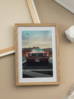 Ein beeindruckendes Poster eines roten Mustangs, der majestätisch auf einer Straße steht. Im Hintergrund erstreckt sich eine malerische Berglandschaft unter einem wunderschönen Himmel. Dieses Bild ist perfekt für Autoliebhaber und verleiht jedem Raum eine dynamische und kraftvolle Atmosphäre.