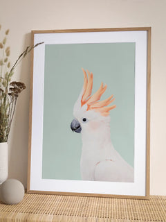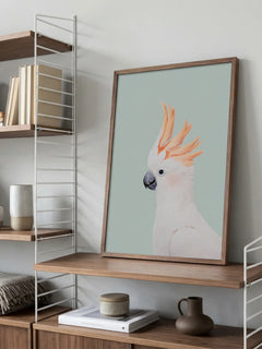 Dieses Poster zeigt eine beeindruckende Fotografie eines weißen Kakadus mit einem auffälligen orangefarbenen Kamm vor einem hellgrünen Hintergrund. Die lebendigen Farben und das elegante Design machen es zu einem perfekten Blickfang für dein Wohnzimmer. Die Kombination aus dem sanften Hintergrund und dem lebhaften Kamm des Kakadus verleiht dem Bild eine harmonische und dennoch dynamische Ausstrahlung.