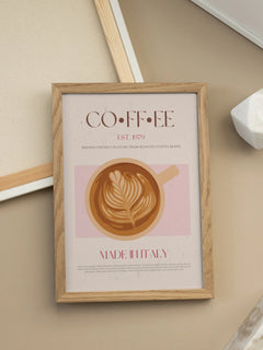 Dieses Poster zeigt eine stilvolle Illustration einer Kaffeetasse mit kunstvoller Latte Art auf einem hellrosa Hintergrund. Der Text beschreibt die Geschichte und Zubereitung von Kaffee und hebt die italienische Kaffee-Tradition hervor. Das Design ist perfekt geeignet, um Ihrer Küche einen Hauch von Eleganz und Wärme zu verleihen.