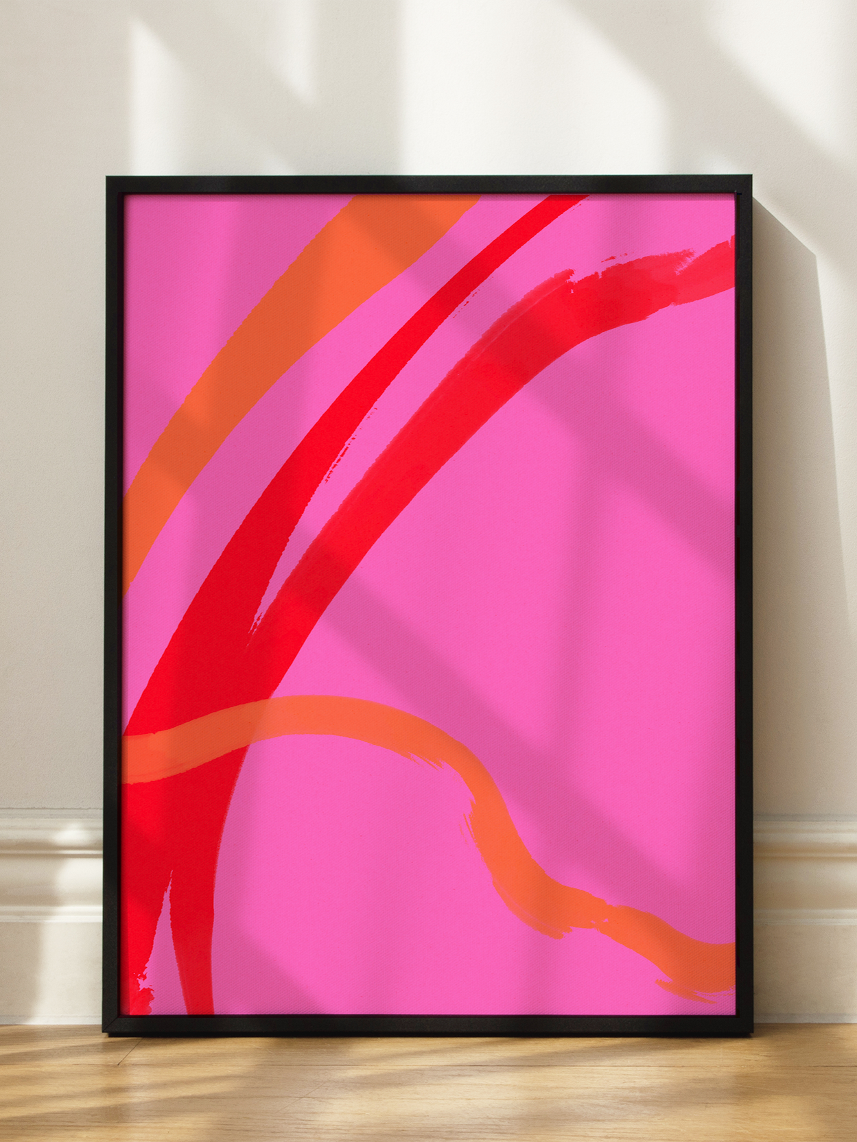 Dieses Poster zeigt ein lebendiges abstraktes Design mit geschwungenen roten und orangefarbenen Linien auf einem pinkfarbenen Hintergrund. Die dynamischen Linien und kräftigen Farben verleihen jedem Raum einen modernen und energiegeladenen Akzent. Perfekt, um einen Farbtupfer in dein Zuhause zu bringen und eine kreative Atmosphäre zu schaffen.