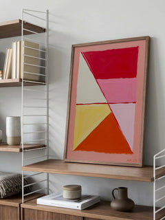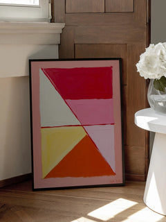 Dieses Poster zeigt handgemalte geometrische Formen in lebhaften Farben wie Rot, Rosa, Gelb und Weiß auf einem rosa Hintergrund. Die Komposition aus Dreiecken und Quadraten verleiht dem Bild einen modernen und dynamischen Charakter, der in jedem Raum ein auffälliges Statement setzt.