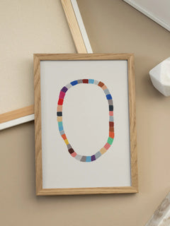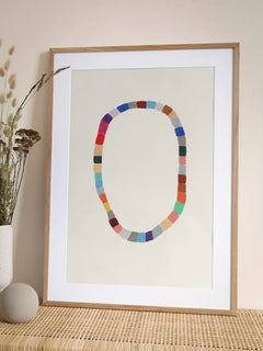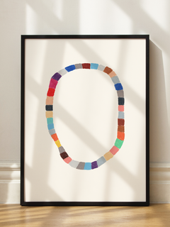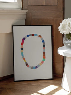 Eine ovale Kette aus bunten Farbquadraten auf hellem Grund. Funktioniert besonders gut in modernen Räumen mit viel Weiß. Die spielerischen Farbtöne setzen einen fröhlichen Akzent.
