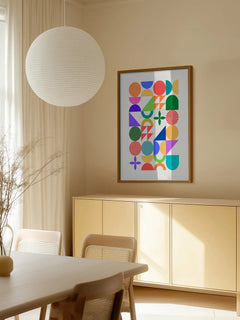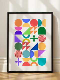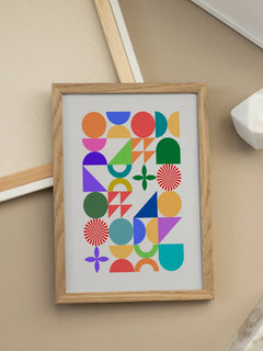Lebendige geometrische Formen in kräftigen Farben schaffen ein modernes Kunstwerk. Funktioniert besonders gut in kreativen Arbeitsräumen oder als Statement-Piece. Die harmonische Komposition aus Kreisen, Dreiecken und Halbkreisen wirkt dynamisch und inspirierend.