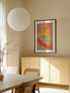 Dieses lebendige Poster zeigt einen Sonnenuntergang in leuchtenden Orange- und Rottönen, umgeben von abstrakten Formen, die an Blätter erinnern. Die geschwungenen Linien und kräftigen Farben schaffen eine dynamische und fröhliche Atmosphäre, die jeden Raum aufhellt. Perfekt, um eine warme und einladende Stimmung in dein Zuhause zu bringen.