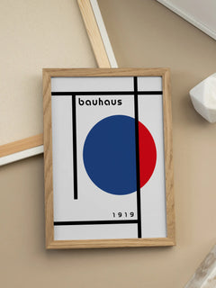 Dieses Poster zeigt ein ikonisches Bauhaus-Design mit schwarzen Linien und einem blauen sowie roten Kreis auf weißem Hintergrund. Der Text "Bauhaus 1919" ist in einem modernen Schriftstil gehalten. Dieses Kunstwerk bringt einen zeitlosen und modernen Look in Ihr Zuhause und ist perfekt für Liebhaber des Bauhaus-Stils.