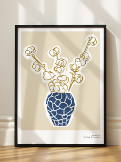 Stilvolle Line Art Illustration zeigt Baumwollzweige in einer gemusterten Vase. Funktioniert besonders gut über Sofas oder Kommoden. Die warmen Beige-Töne mit blauem Akzent ergänzen moderne Einrichtung.
