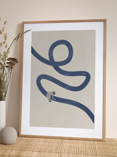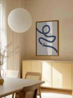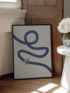 Dieses Poster zeigt ein kleines Kind, das eine blaue, geschwungene Linie auf einem beigen Hintergrund malt. Die Darstellung fängt die kindliche Kreativität und Fantasie ein und inspiriert zur freien Entfaltung. Die minimalistische Komposition und die sanften Farben machen es zu einer idealen Ergänzung für jede Bilderwand.