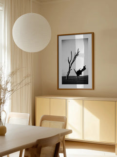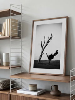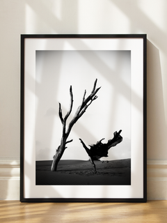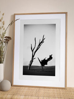 Eine beeindruckende Schwarz-Weiß-Fotografie, die eine Ballerina zeigt, die anmutig in der Wüste neben einem kahlen Baum tanzt. Die Komposition verbindet die Eleganz des Balletts mit der rauen Schönheit der Wüstenlandschaft und schafft ein faszinierendes visuelles Erlebnis. Dieses Kunstwerk ist ideal für Liebhaber von Tanz und Fotografie und verleiht jedem Raum eine künstlerische Note.