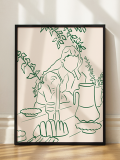 Ein minimalistisches Poster, das eine Frau beim Dinner zeigt. Mit grünen Linien auf beigefarbenem Hintergrund bringt es eine elegante und entspannende Atmosphäre in dein Zuhause. Die Darstellung umfasst einen gedeckten Tisch mit Geschirr und Pflanzen, die eine harmonische und friedliche Gartenszene schaffen.