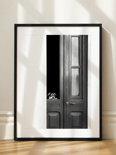 Dieses Schwarz-Weiß-Poster zeigt einen Hund, der neugierig aus einer halb geöffneten Tür schaut. Der Ausdruck des Hundes vermittelt ein Gefühl von Neugier und Erwartung. Die Komposition ist einfach und doch eindrucksvoll, wobei der Kontrast zwischen dem dunklen Inneren und der hellen Tür die Aufmerksamkeit auf den Hund lenkt. Ein perfektes Kunstwerk für Tierliebhaber und alle, die subtile, ausdrucksstarke Fotografie schätzen.