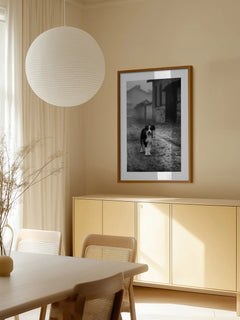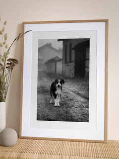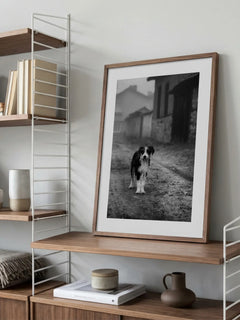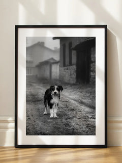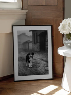 Ein eindrucksvolles Schwarz-Weiß-Fotoposter, das einen Hund zeigt, der auf einer verlassenen Straße steht. Die Szene strahlt einen nostalgischen Vintage-Charme aus und fängt die Essenz eines ruhigen, ländlichen Lebens ein. Die unscharfen Gebäude im Hintergrund verstärken das Gefühl von Einsamkeit und Ruhe, während der Hund im Vordergrund eine Verbindung zur Natur und Einfachheit herstellt. Dieses Kunstwerk ist perfekt für Liebhaber von Tieren und klassischer Fotografie.