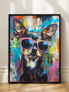 Dieses lebendige Poster zeigt einen Hund mit einer bunten Sonnenbrille vor einem dynamischen, farbenfrohen Hintergrund. Die kräftigen Farben und der verspielte Ausdruck des Hundes verleihen jedem Raum eine fröhliche und energiegeladene Atmosphäre. Perfekt für Tierliebhaber und alle, die ein wenig Spaß und Farbe in ihr Zuhause bringen möchten.