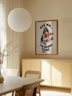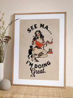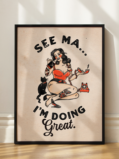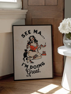 Dieses Poster zeigt eine Frau im Vintage-Stil, die von einer schwarzen Katze und einem zerbrochenen Telefon umgeben ist. Der Text "See ma...I'm doing great" verleiht dem Bild eine humorvolle Note. Der Retro-Look mit beigem Hintergrund macht es zu einer idealen Dekoration für Schlafzimmer oder Flur, um einen Hauch von Nostalgie und Stil zu verleihen.