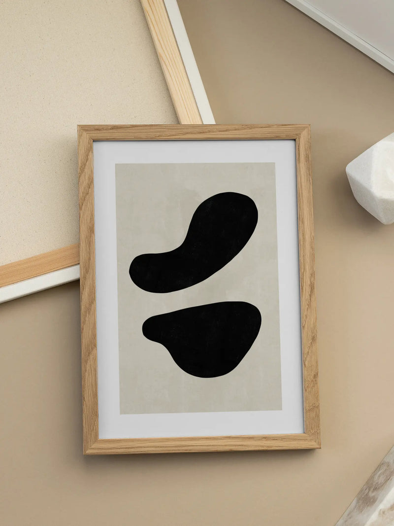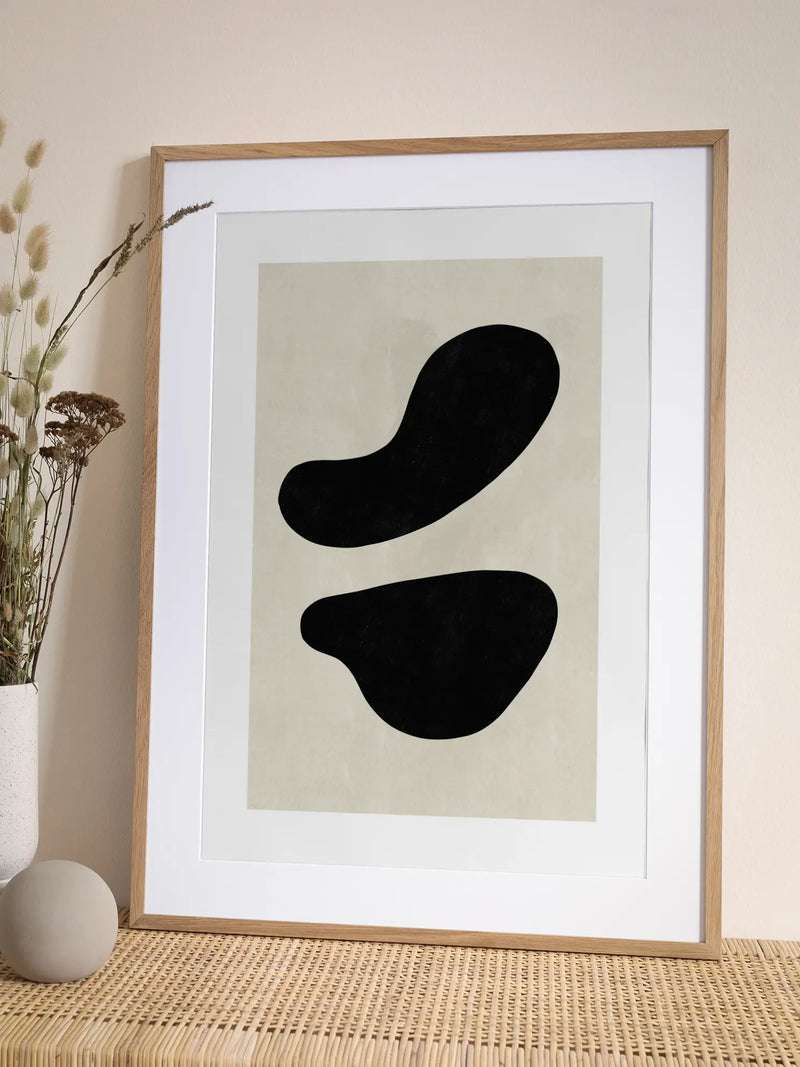 Dieses Poster zeigt eine grafische Illustration mit zwei großen schwarzen Formen auf einem beigen Hintergrund. Die abstrakte Komposition verleiht jedem Raum eine moderne und minimalistische Note. Perfekt für Liebhaber von schlichter und stilvoller Dekoration, die ein zeitgenössisches Ambiente schaffen möchten.