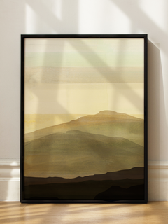 Erdige Berglandschaft in sanften Aquarelltönen mit abstrakten Hügeln und Bergen in Braun- und Beigetönen. Funktioniert besonders gut über dem Sofa oder Bett. Die ruhige Komposition wirkt entspannend und harmonisch.
