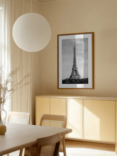 Diese Schwarzweiß-Fotografie zeigt den ikonischen Eiffelturm vor einem bewölkten Himmel. Das Bild fängt die majestätische Struktur des Turms ein und verleiht jedem Raum einen Hauch von Pariser Eleganz. Perfekt für Liebhaber klassischer Architektur und zeitloser Designs, bringt dieses Poster einen Hauch von Geschichte und Romantik in Ihr Zuhause.