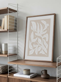 Dieses Poster zeigt eine grafische Illustration von weißen Blättern auf einem beigen Hintergrund. Die sanften Farbtöne und der minimalistische Stil machen es ideal für moderne, schlichte Wohnräume. Es bringt eine ruhige und natürliche Atmosphäre in Ihr Zuhause und passt perfekt zu einem minimalistischen Einrichtungsstil.